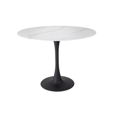 Mesa de diámetro 100 cm, con cubierta de cerámica símil mármol y base metálica negra, ideal para espacios modernos y sofisticados.