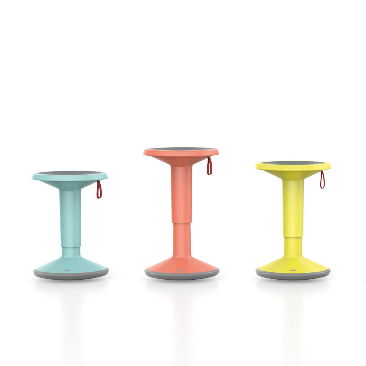 Características: base redonda. Su base tiene una forma curva, que permite el movimiento activo de la persona y cuenta con una correa que sirve de arrastre y cómo piston de sube y baja de la altura del asiento.