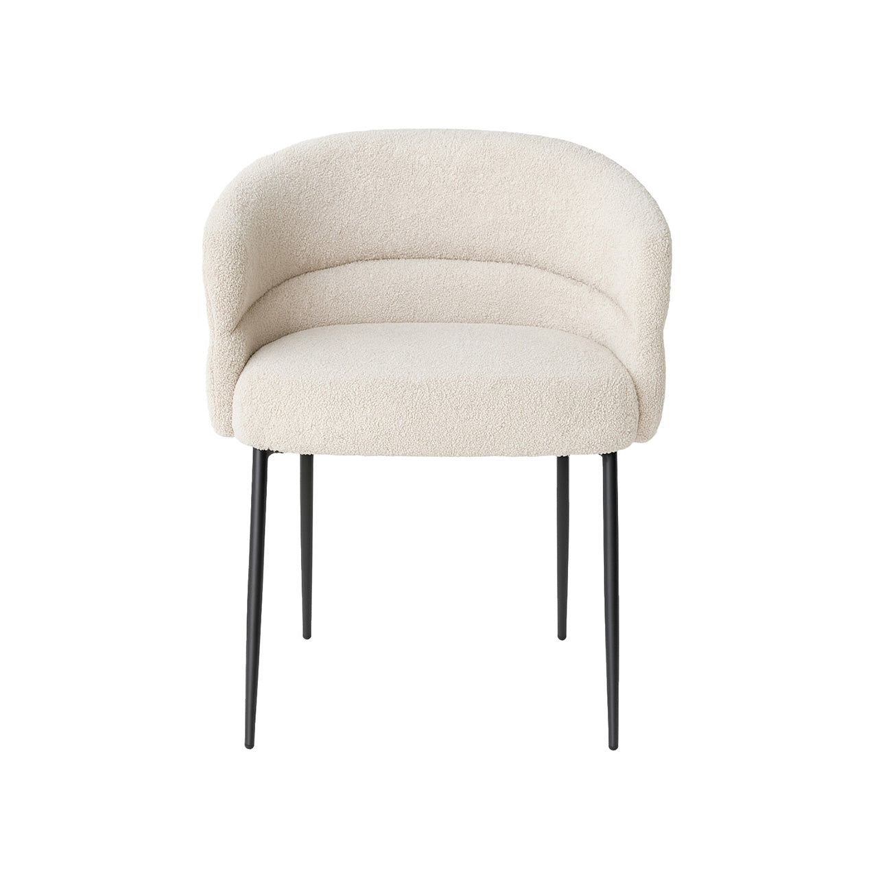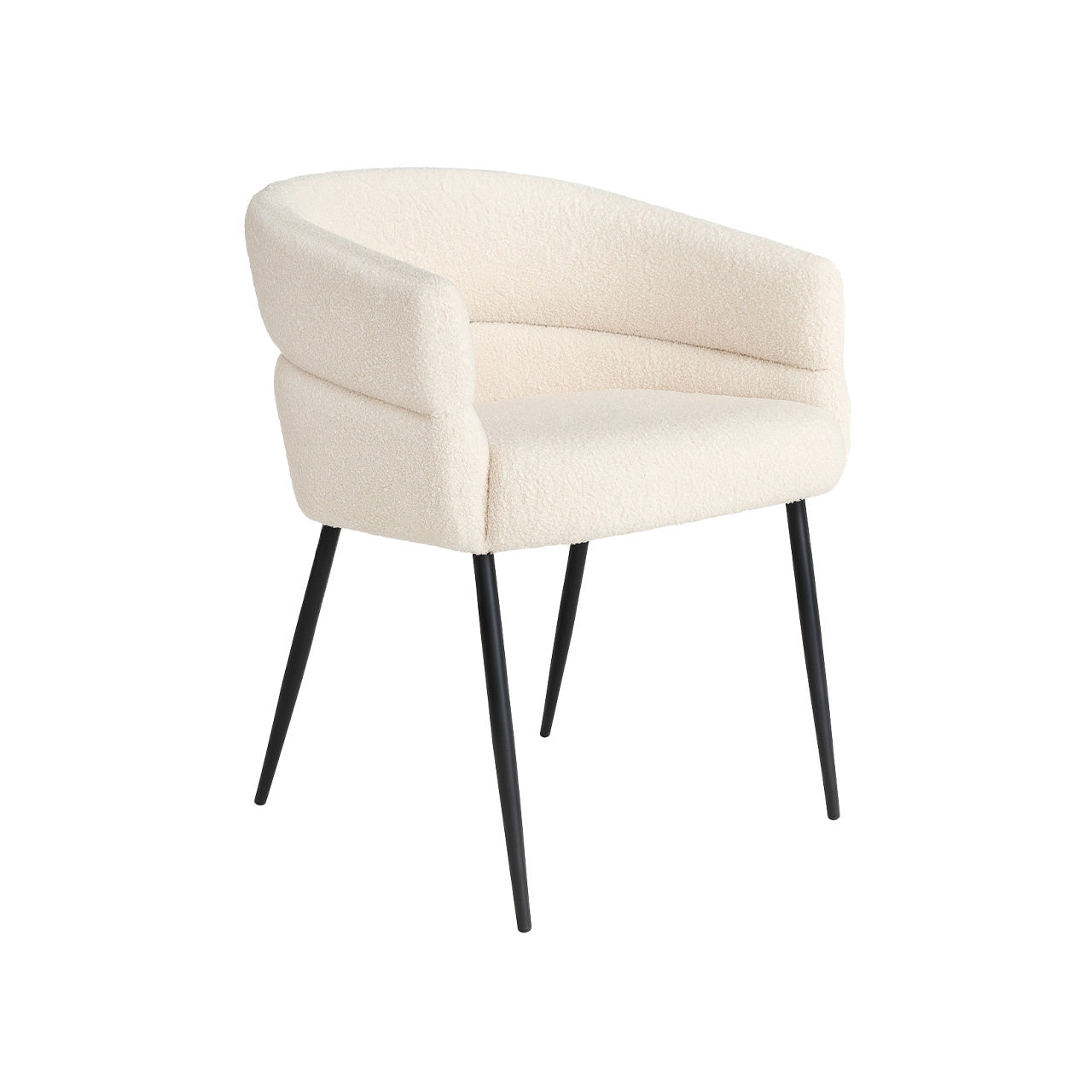 Material Patas metálicas lacadas, asiento y respaldo de espuma tapizado en tela mini boucle.