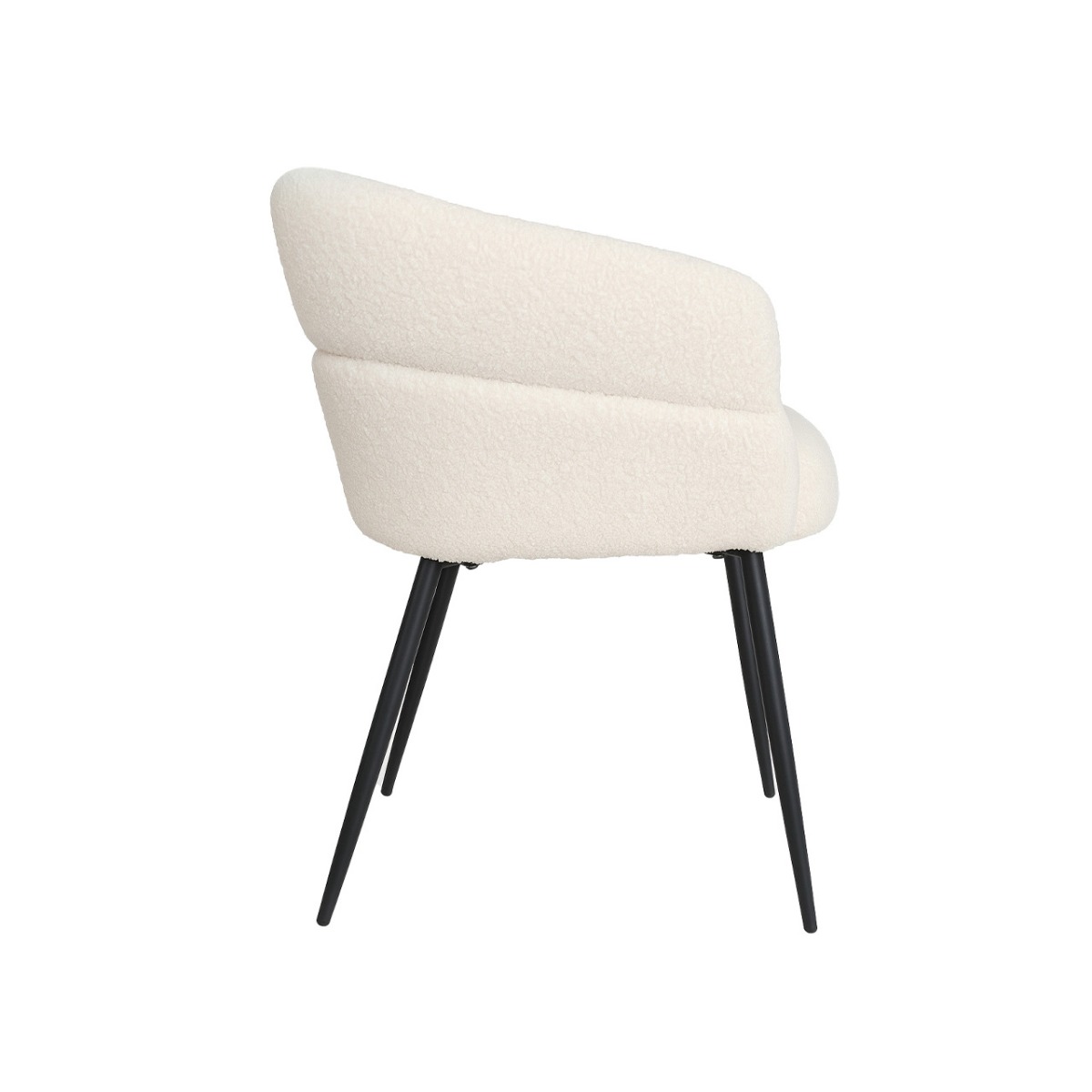 Patas metálicas lacadas, asiento y respaldo de espuma tapizado en tela mini boucle.