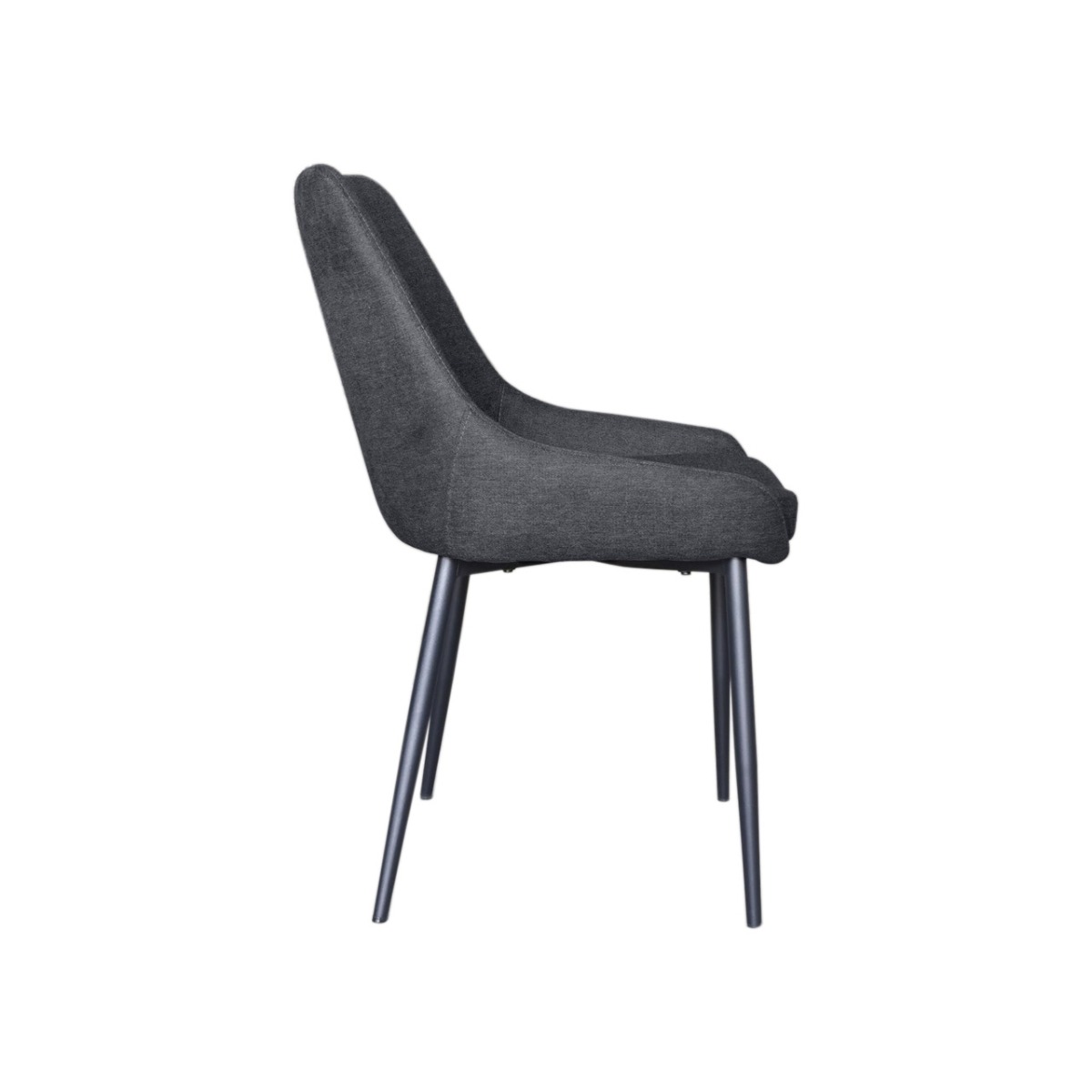 Silla con asiento de espuma tapizada en tela, con patas metal lacadas.