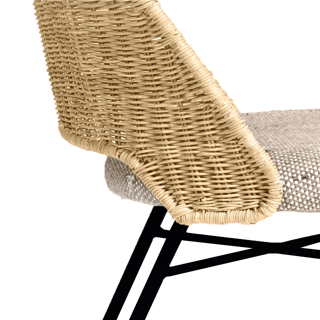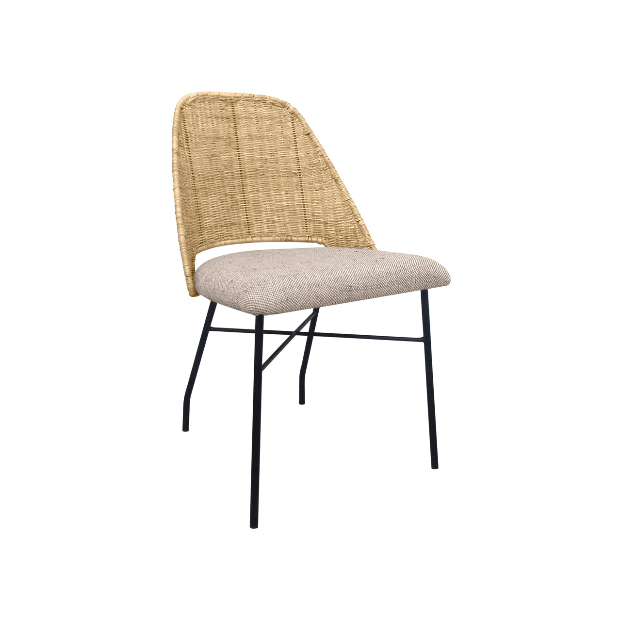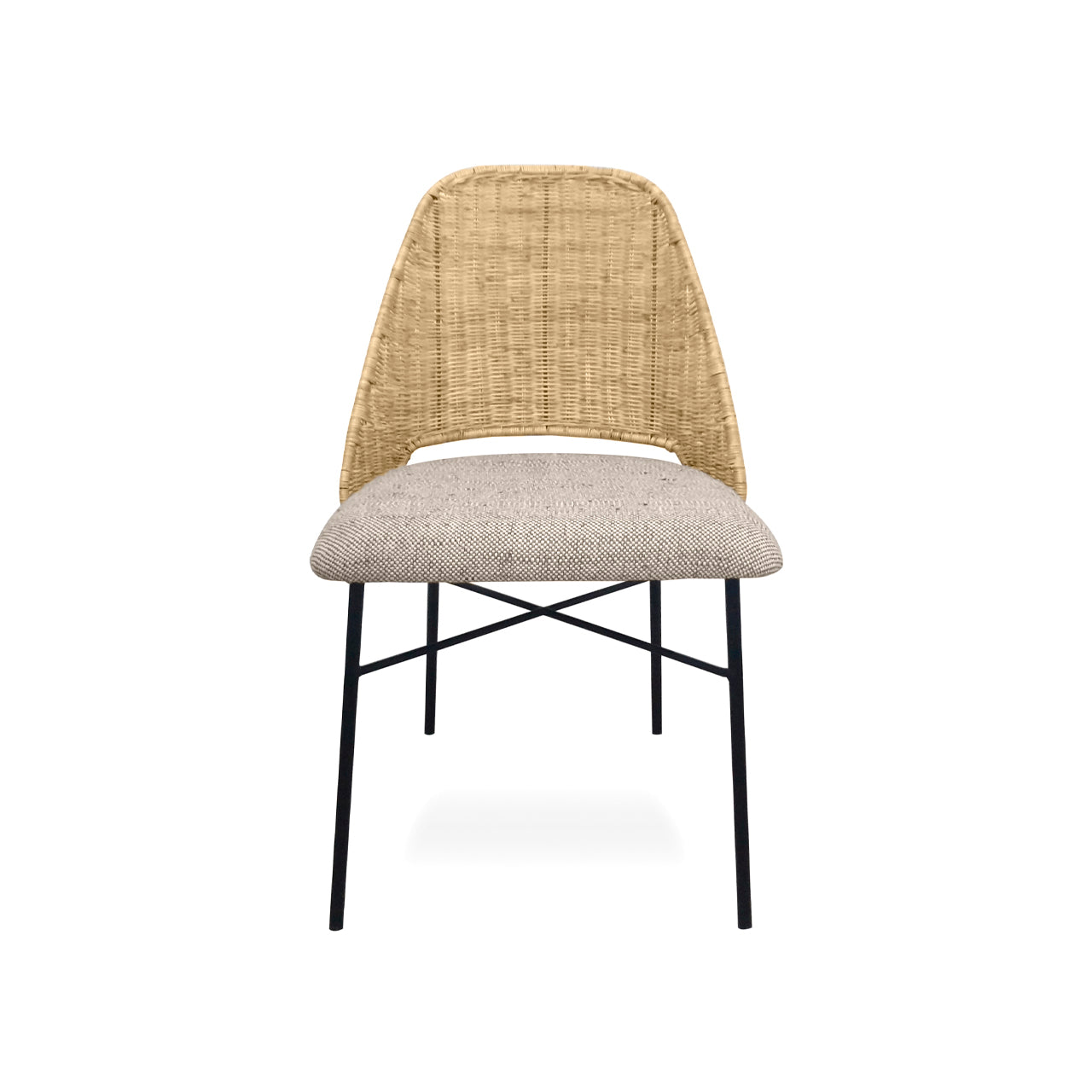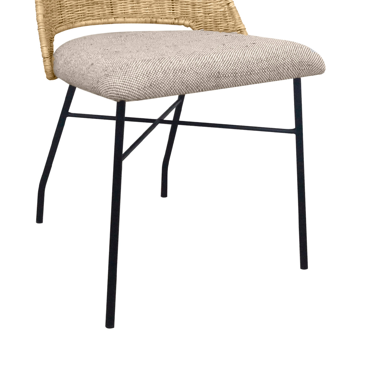 Material Estructura metálica lacada, respaldo de rattan, asiento de espuma tapizado en tela.