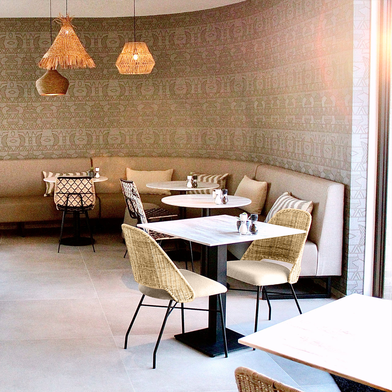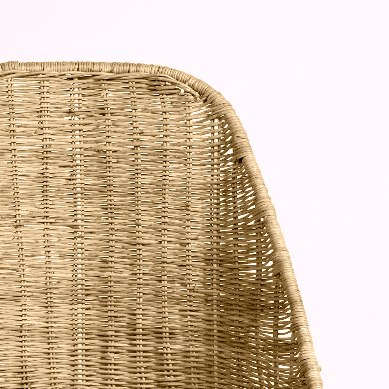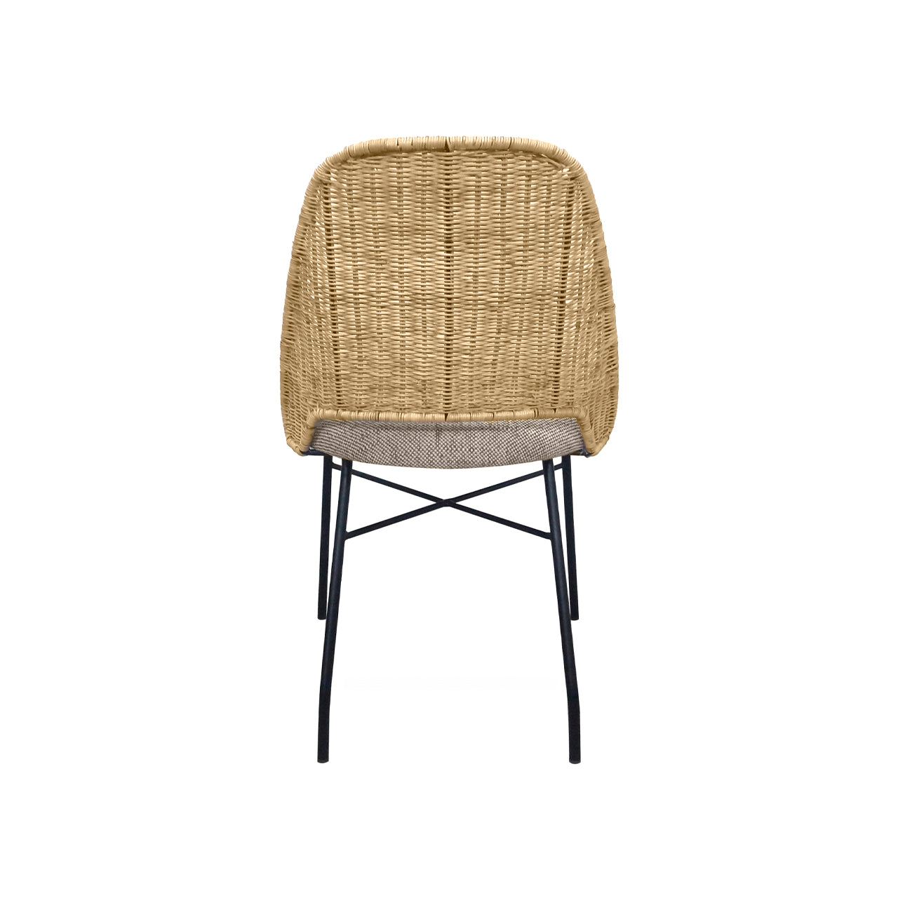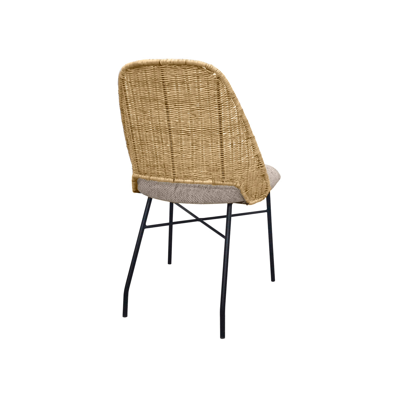 Material Estructura metálica lacada, respaldo de rattan, asiento de espuma tapizado en tela.